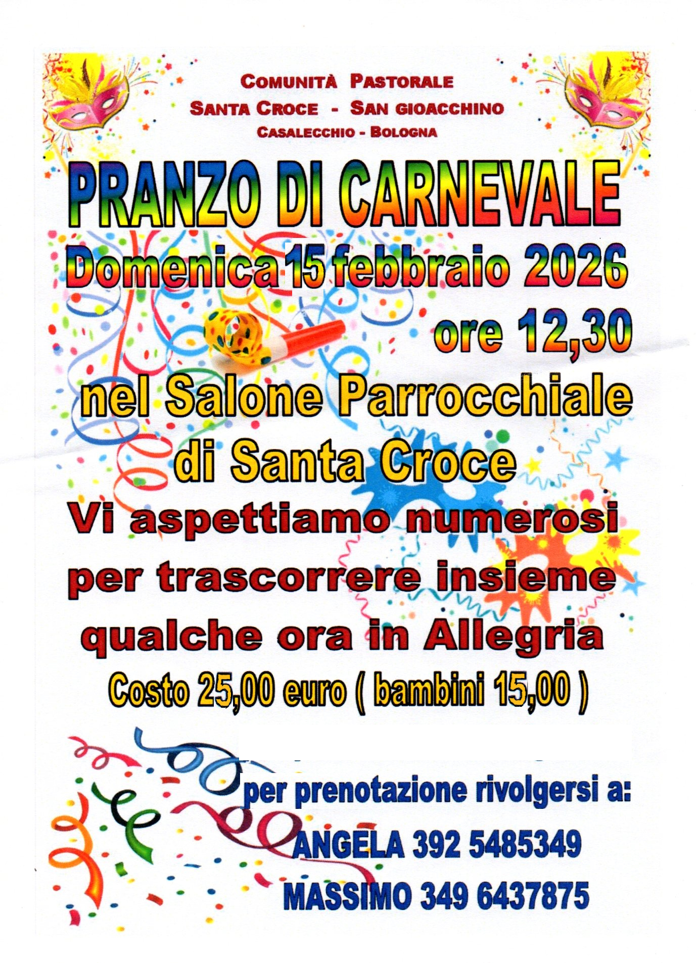 Parrocchia di Santa Croce Domenica 15 febbraio 2026 PRANZO DI CARNEVALE Con sfrappole PARTECIPATE NUMEROSI!!! Prenotare al più presto in parrocchia Euro 25 (bambini euro 15) posti limitati |